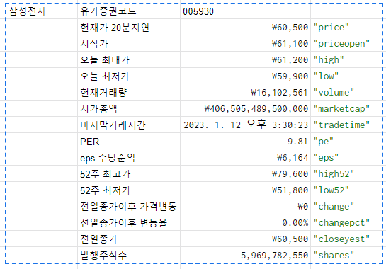 =GOOGLEFINANCE(원하는 티커, "shares") - 총 주식 발행 수