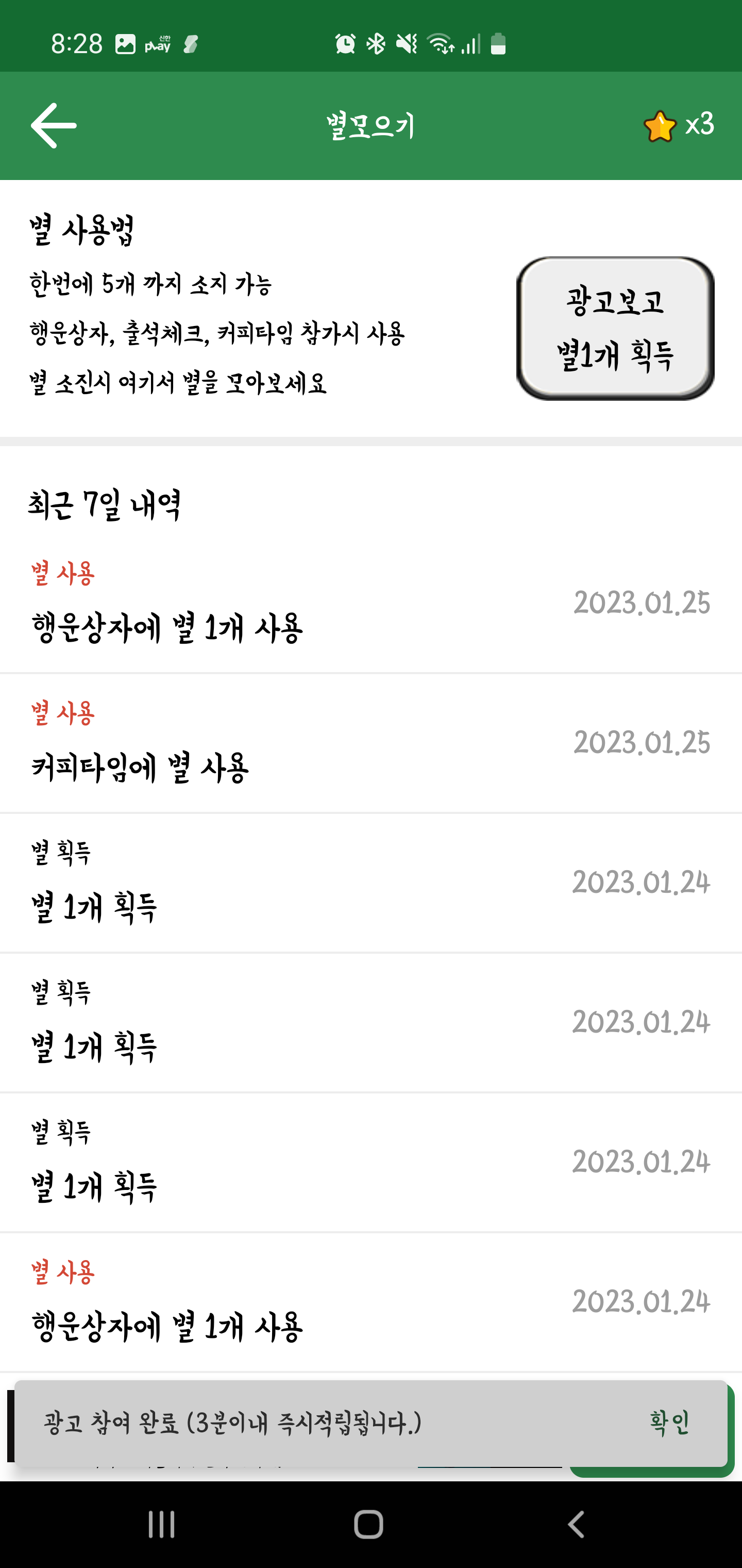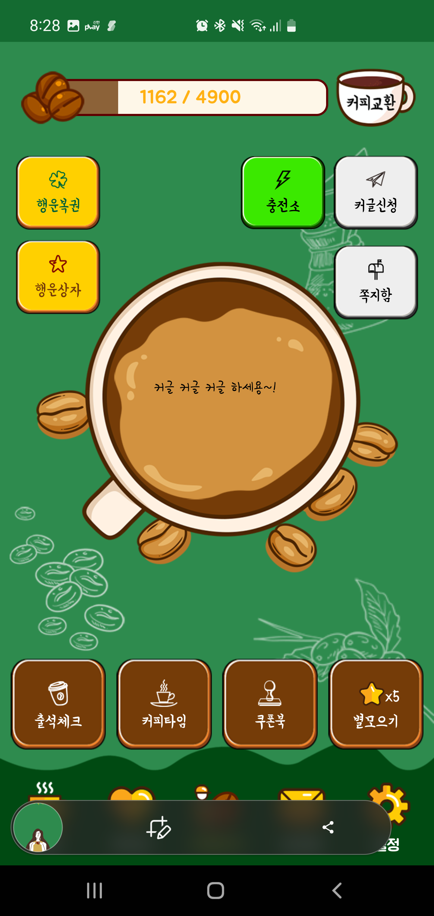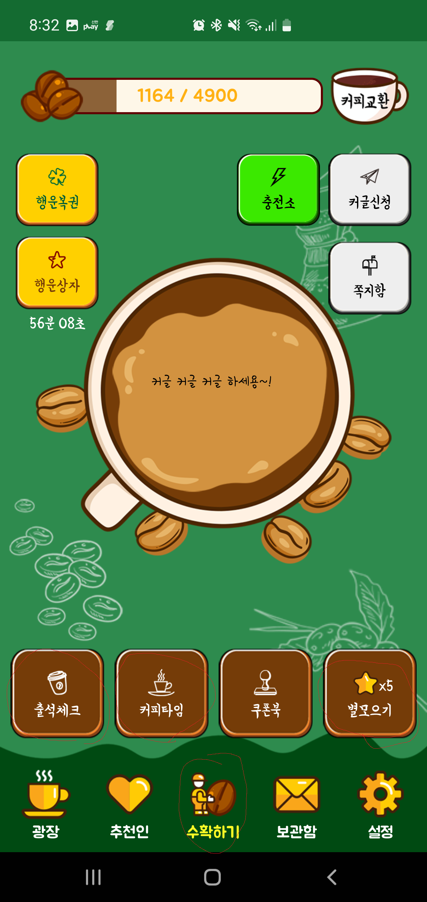 대략 출첵 커피타임 수확하기를 통해서 커피콩을 모을 수 있습니다. 총 4900 콩을 모으면 스타벅스 커피 T 1개 교환이 가능합니다. 광고를 보고 별을 이용해서 출첵 커피타임 행운상자를 오픈함으로써 콩을 추가로 획득 가능합니다.