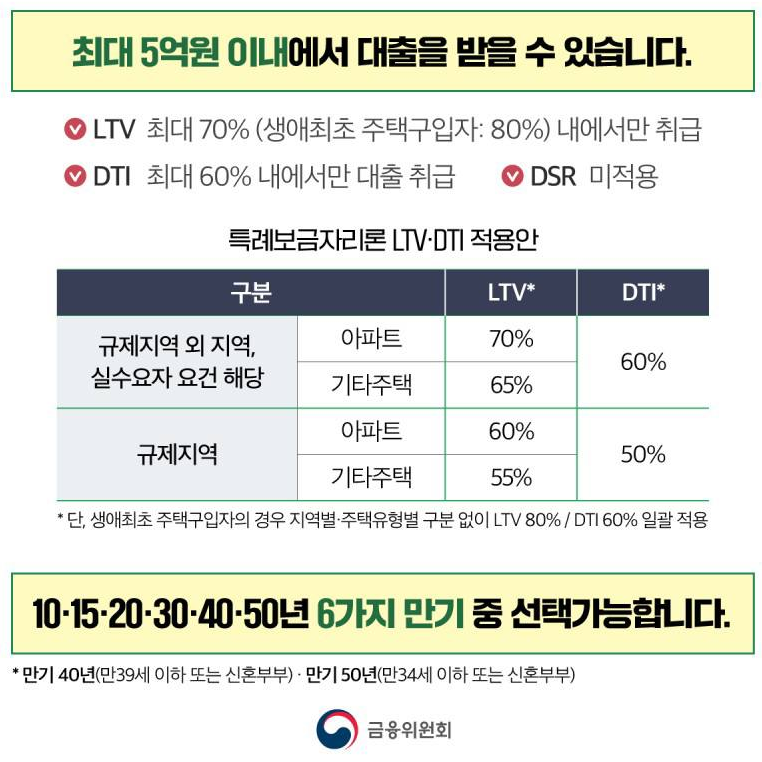 - LTV 최대 70%(생애최초는 80%까지 최대)