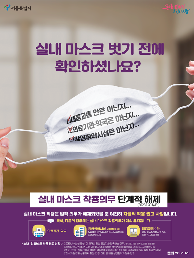 - 마스크 착용 의무가 조정됐다고 해서 마스크 착용이 불필요하다는 것은 아니며, 과태료가 부과되는 국가 차원의 의무 조치만 해제된 것이므로 상황에 따른 개인의 자율적 착용 실천은 여전히 중요합니다.