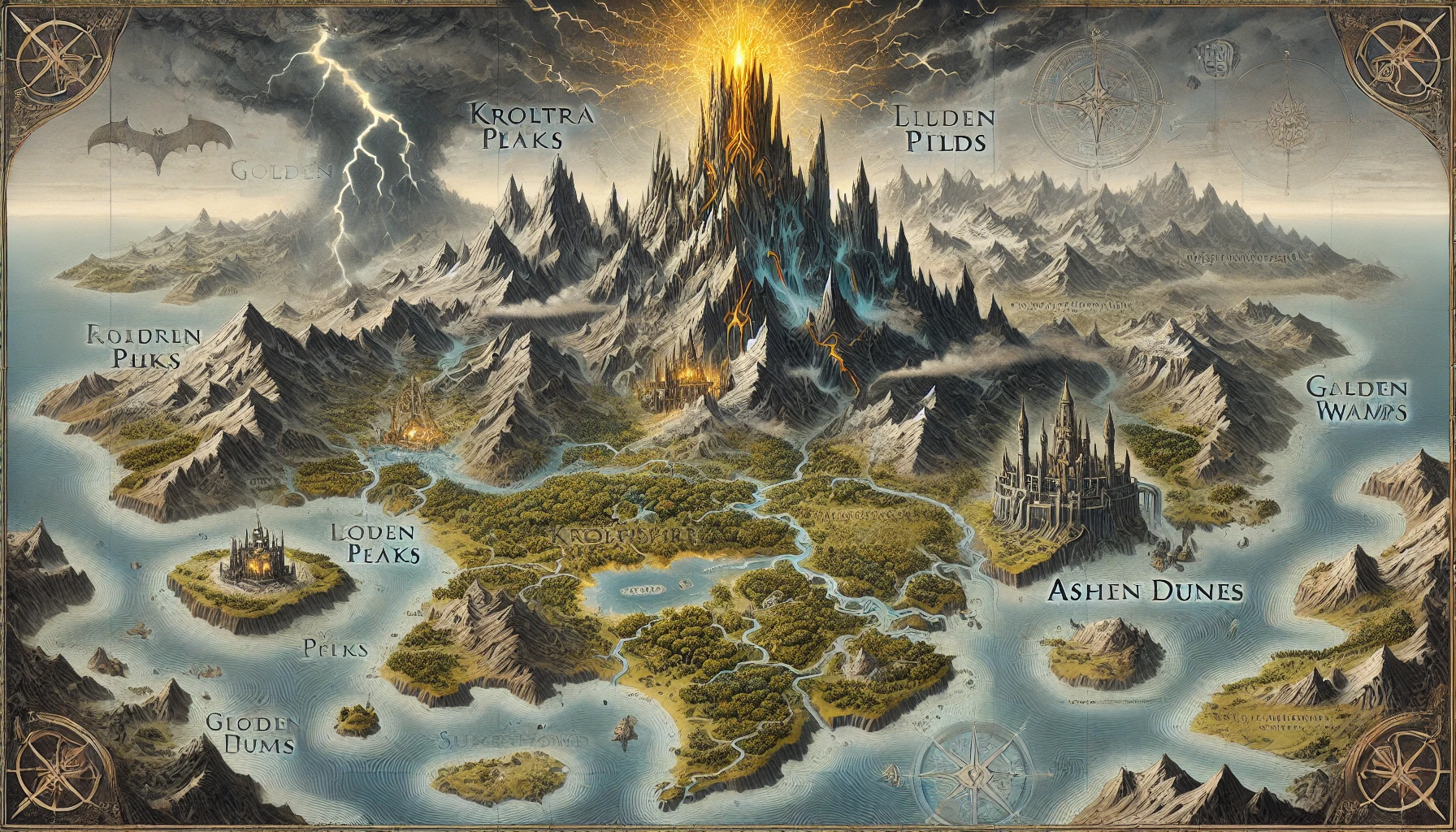 - 특징: 넓은 초원과 강이 흐르는 비옥한 땅. 성곽 도시들이 점점이 흩어져 있고, 황금 탑을 향한 순례 길이 뻗어 있다.