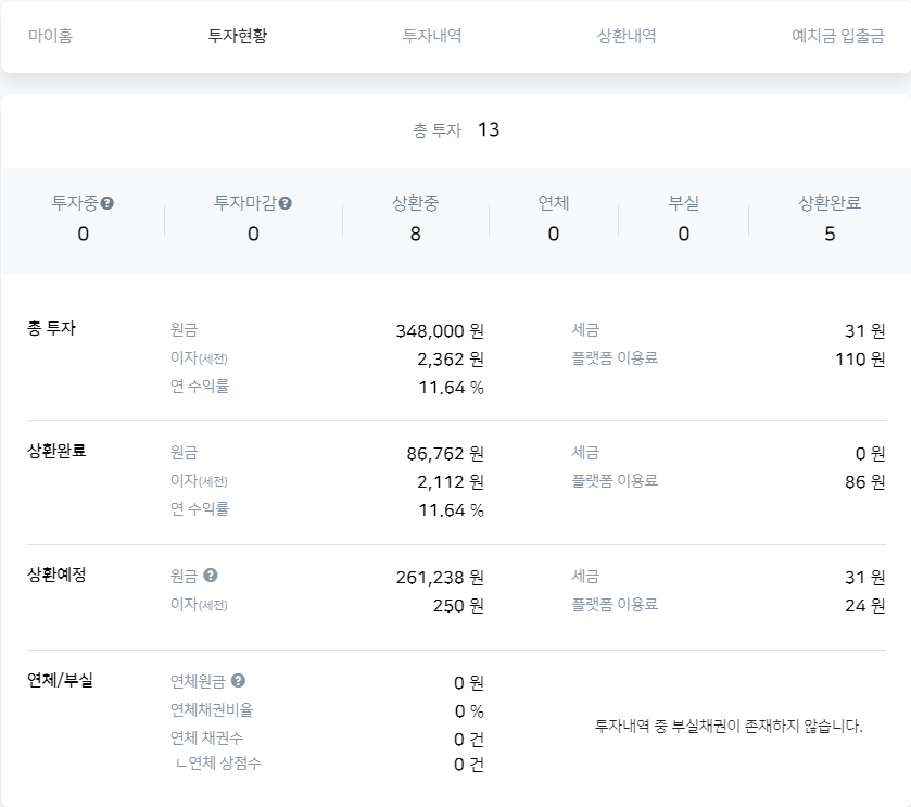 년 15%로라고 생각하지는 않습니다. 생각보다 일찍 상환할 경우도 있습니다. 제 투자 현황입니다.